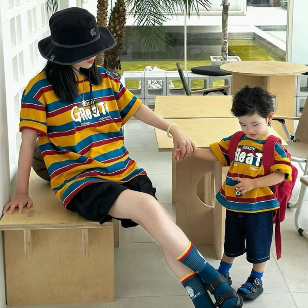 このTシャツはユニセックスデザインで、親子でお揃いのスタイルを楽しむことができ、さまざまなコーディネートが可能です。シンプルながらも遊び心のある配色は、家族の絆を感じさせる素敵なスタイルを演出します。心地よい着心地と優れた通気性は、夏の日差しの中でも快適さを提供し、親子での特別な瞬間を彩る一着となることでしょう!