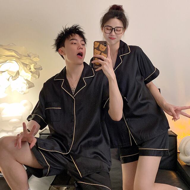 ・ペアルック ブラック アイスシルクパジャマ(半袖・大きいサイズ対応)は、スタイリッシュで快適なナイトルックを提供するアイテムです!